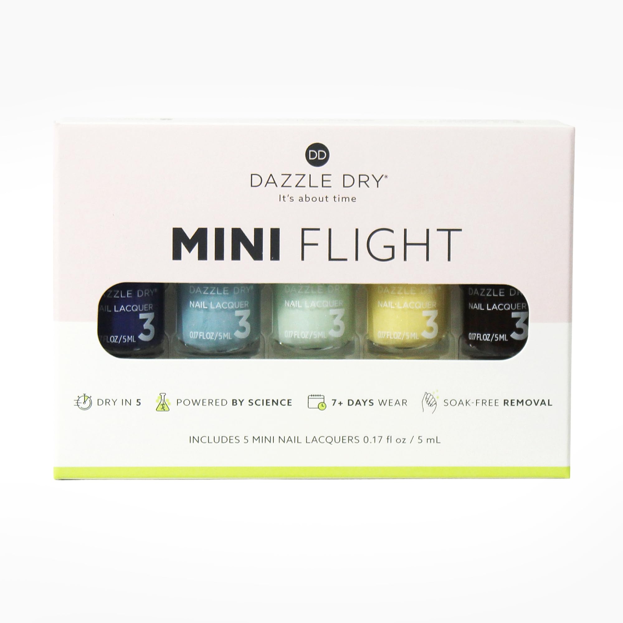 - DAZZLE DRY ELEVATION MINI FLIGHT: Frosty blues, airy pastels, and deep mulled wine evoke snowy peaks, crisp mountain air, and après-ski elegance. Everything you love from our nail lacquers in mini bottles (0.17 fl oz / 5 ml ea). Our lacquers dry in seconds, helping to minimize mistakes. When used as a system, our unique formula offers longer-lasting, salon-quality results with no chipping, peeling or fading for 7+ days.